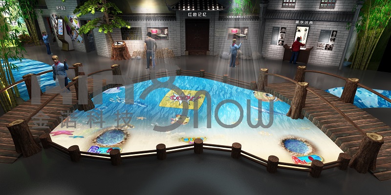 依托河流布景投影出魚蝦成群的動(dòng)態(tài)情境,展項(xiàng)設(shè)計(jì)自由模式和競(jìng)賽模式兩種,一定時(shí)間后隨機(jī)切換。