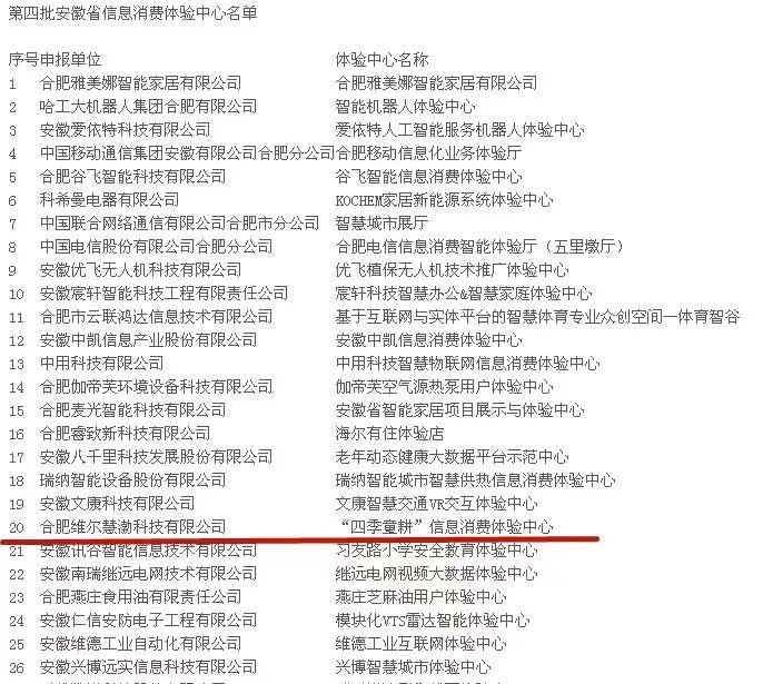 2018年12月29日,由安徽省經(jīng)濟(jì)和信息化廳發(fā)布通知,公布了第四批安徽省信息消費(fèi)體驗(yàn)中心名單,合肥金諾數(shù)碼科技股份有限公司旗下子公司合肥維爾慧渤科技有限公司經(jīng)營的“四季童耕”探索樂園榮獲安徽省信息消費(fèi)體驗(yàn)中心稱號(hào)。
