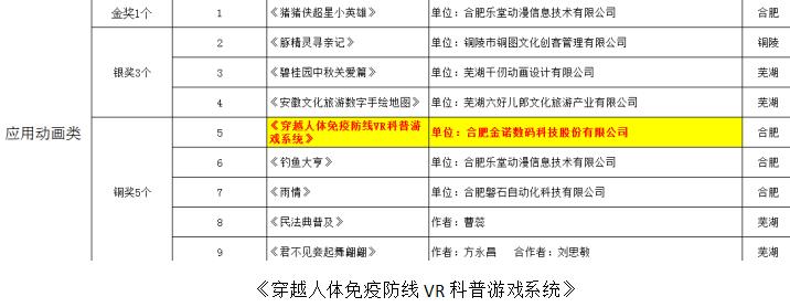 其中,安徽省動漫大賽參賽評選分為社會組與院校組,設置影視動畫類、漫畫插畫類、應用動畫類三個評獎類別,金諾科技《有巢氏傳奇》和《穿越人體免疫防線VR科普游戲系統(tǒng)》兩部動畫作品分別在影視動畫類、應用動畫類作品評選中榮獲銅獎,以出色的劇情構思和精心的創(chuàng)意制作獲得組委會評審專家的肯定。
