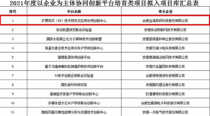 其中,由金諾科技研發(fā)的“基于AIoT技術(shù)智慧科技館管理系統(tǒng)”,作為人工智能領(lǐng)域前沿創(chuàng)新技術(shù),被列入2021年合肥市新技術(shù)榜單;而以金諾科技為牽頭企業(yè)、與安徽大學(xué)聯(lián)合建設(shè)的“擴(kuò)展現(xiàn)實(shí)(XR)技術(shù)研發(fā)及應(yīng)用協(xié)同創(chuàng)新中心”,則歷經(jīng)遴選成功通過評(píng)審,入選為2021年合肥高新區(qū)以企業(yè)為主體的協(xié)同創(chuàng)新平臺(tái)項(xiàng)目。