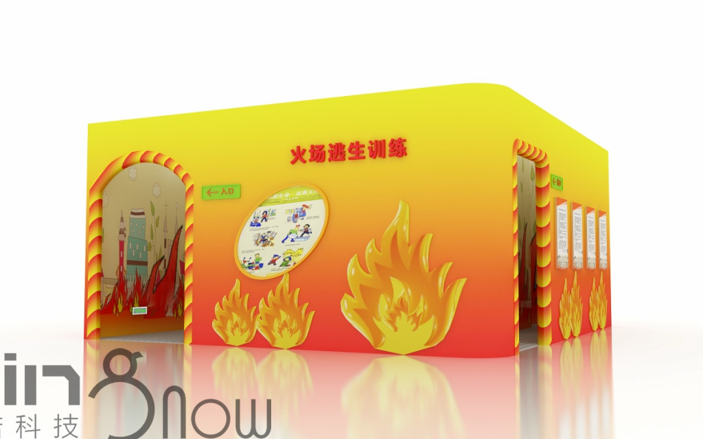 該產(chǎn)品設(shè)置火場逃生通道,通道內(nèi)有高度傳感器,音響系統(tǒng),監(jiān)視系統(tǒng),報警系統(tǒng),模擬煙霧系統(tǒng)組成,觀眾將練習(xí)從火災(zāi)現(xiàn)場、通過煙霧通道中逃離的過程,墻上設(shè)置各種安全出口標識。同時墻面會設(shè)置傳感器,識別觀眾的逃生姿勢是否正確。觀眾彎腰穿越煙霧通道。一旦高度超過安全距離,警報聲就會響起。通道內(nèi)窗口嵌入液晶電視播放火災(zāi)現(xiàn)場視頻,出口處設(shè)有電梯口、窗口樓梯口設(shè)置兩扇門和一個電梯門,參與者選擇正確的門,離開火場,否則無法走出通道。