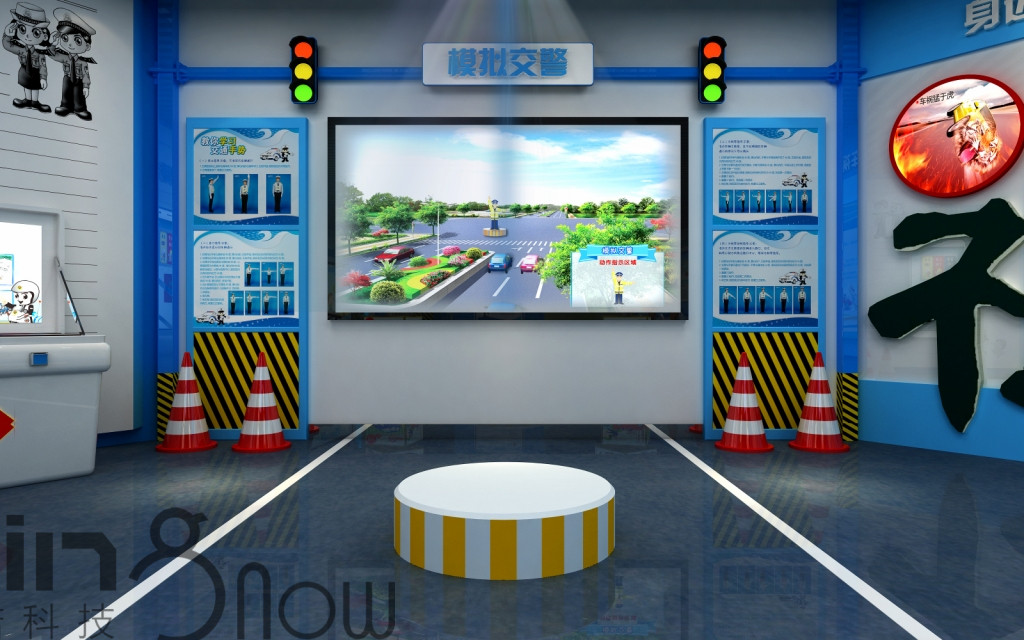 1) 觀眾站在交通指揮臺(tái)上后,觸發(fā)感應(yīng)啟動(dòng)投影,隨機(jī)出現(xiàn)不同的交通道路畫面(共八套內(nèi)容);