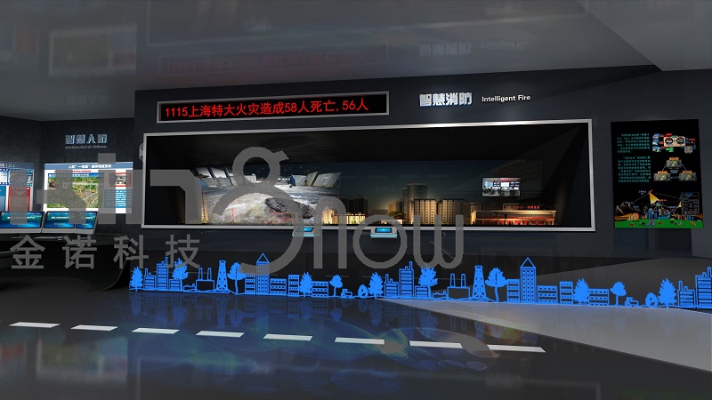 當(dāng)參觀者觸摸感應(yīng)按鈕時,立體建筑剖面模型中的煙霧發(fā)生器和報警器啟動,建筑模型中的真實消防系統(tǒng)啟動,與液晶顯示屏、幻影成像畫面聯(lián)動,綜合介紹智慧消防系統(tǒng)的系統(tǒng)組成和主要功能。