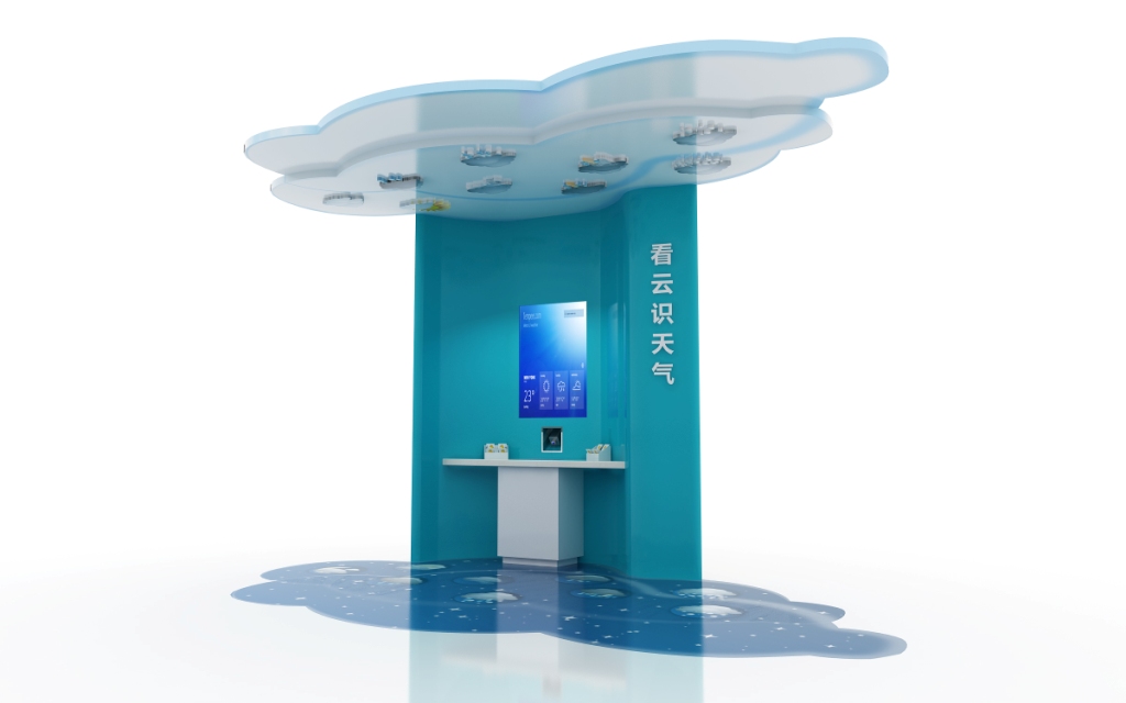 該展項(xiàng)通過模型布景,體現(xiàn)云的家族,如卷云、積云、卷層云、高層云、雨層云、積雨云等,把這些云懸吊在半空中,營造整個(gè)環(huán)境氛圍,并且地面標(biāo)注出云層名稱與之對(duì)應(yīng)。在模型布景下方設(shè)置展臺(tái),展臺(tái)上設(shè)置云圖案檢測(cè)區(qū),觀眾把相應(yīng)云層圖案標(biāo)識(shí)(設(shè)計(jì)成鑰匙串形式,并把圖案設(shè)置在每個(gè)面上)放置在檢測(cè)區(qū),系統(tǒng)將會(huì)通過攝像頭檢測(cè)到該圖案,從而觸發(fā)后臺(tái)信息加載到顯示界面(豎屏鑲嵌);觀眾也可選擇其他圖案,全方位了解其他云層,同時(shí)畫面中會(huì)出現(xiàn)相應(yīng)知識(shí)介紹,讓觀眾加深對(duì)該云層的深入了解。
