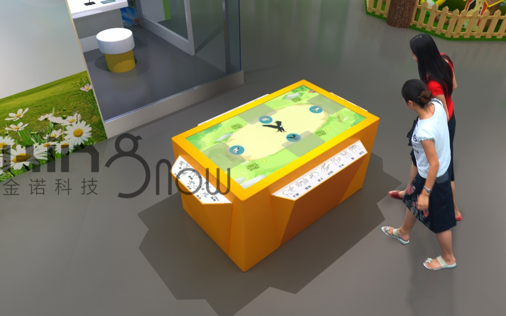 1、造型展臺(tái)中間鑲嵌60寸液晶顯示屏,臺(tái)面上的液晶屏上方覆蓋一層玻璃,玻璃臺(tái)面的四面各有一個(gè)手勢識(shí)別區(qū),同時(shí)可供四人同時(shí)參與游戲。在每邊的識(shí)別區(qū)旁邊都用圖文介紹手影藝術(shù),注解手影的施展方法。